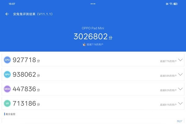 OPPO Pad Mini 是业内首款搭载骁龙 8 Gen5 的小尺寸平板,这个"首款"本身就说明了 OPPO对这款产品的定位决心。加上石墨+VC组合的高达33779mm,能够保障性能的持久满血释放。实测安兔兔跑分突破300万分。